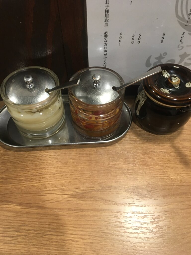 On the table, you'll find essentials like Grated Garlic, Chili-Marinated Garlic (perfect for a spicy kick), and Takana (Spicy Pickled Mustard Greens).