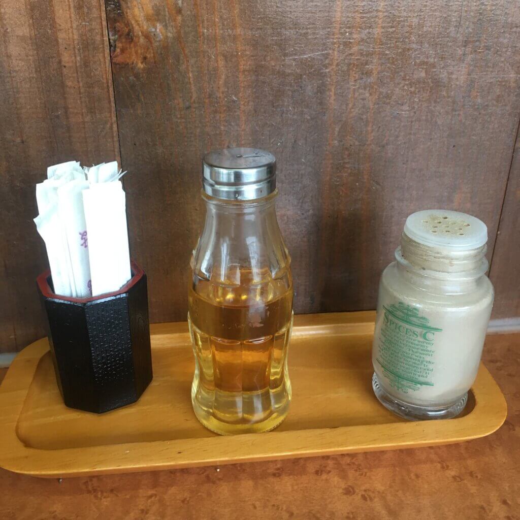 The minimal setup consists of just two condiments: pepper and vinegar. This minimalist configuration is key to the shop's concept, ensuring nothing breaks the delicate harmony of this masterpiece.